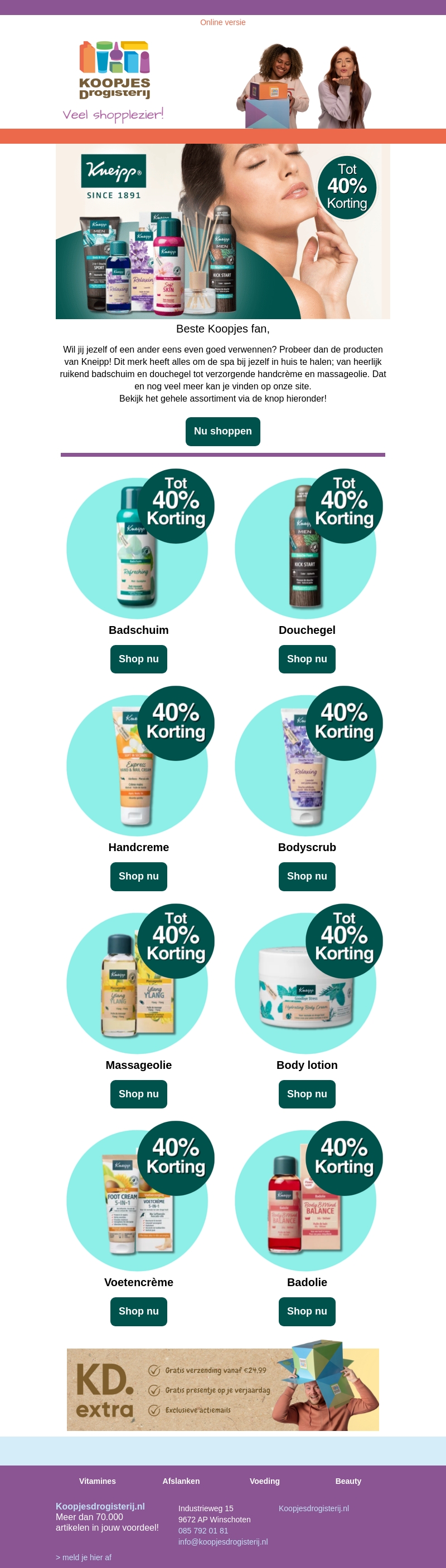 Deze week in de spotlight: Kneipp! Geniet van tot 40% korting op een breed scala aan verzorgingsproducten. Kies uit verfrissende badschuim, voedende douchegels, en meer. Ideaal voor een spa-ervaring thuis. Ontdek het volledige assortiment bij Koopjes Drogisterij.