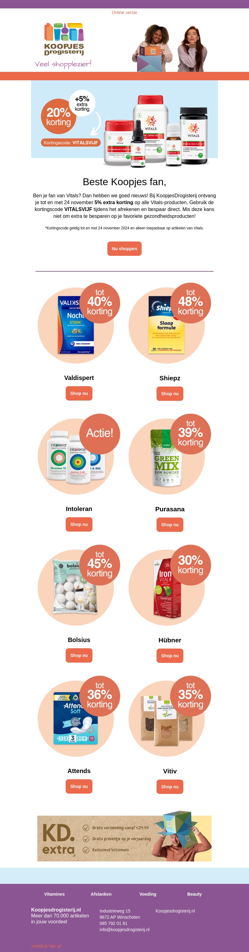 Ben je fan van Vitals? Profiteer nu van extra korting op al je favoriete Vitals-producten bij KoopjesDrogisterij! Gebruik de exclusieve kortingscode VITALSVIJF en ontvang tot wel 5% extra korting bovenop de bestaande kortingen. Mis deze kans niet om te besparen op gezondheidsproducten. Het aanbod geldt tot 24 november 2024. Begin nu met winkelen!