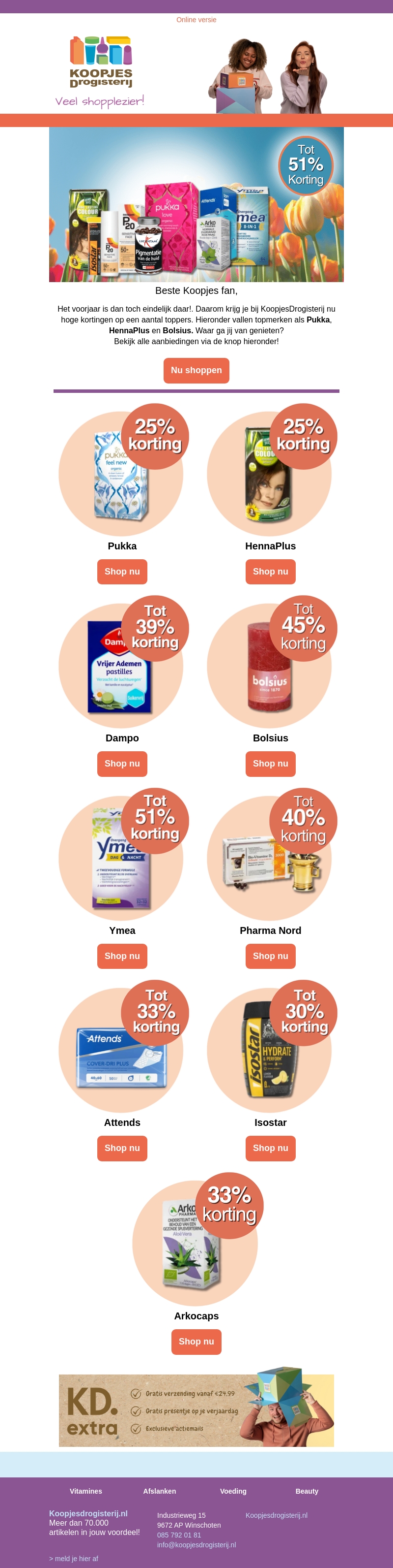 Beste Koopjes fan, het voorjaar brengt fantastische deals bij KoopjesDrogisterij. Profiteer van hoge kortingen op merken als Pukka, HennaPlus en Bolsius. Acties gelden op diverse producten, dus er is voor ieder wat wils. Bezoek onze website en ontdek de aanbiedingen. Mis deze kans niet om te besparen! Shop nu en geniet van het voorjaar!