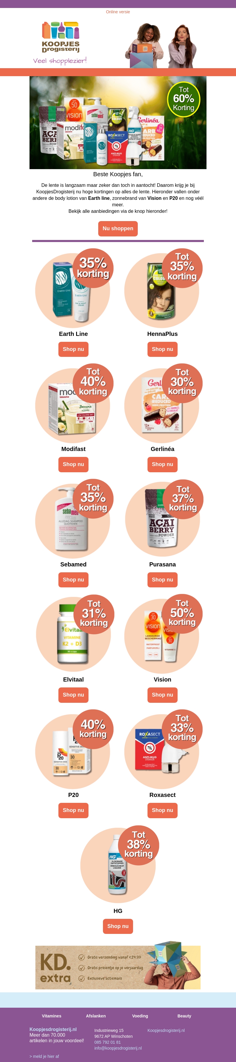 De lenteaanbiedingen zijn gearriveerd bij KoopjesDrogisterij! Geniet van tot 60% korting op populaire merken zoals Earth Line, HennaPlus, Modifast en meer. Revitaliseer je huid, haar en gezondheid met onze zorgvuldig geselecteerde producten. Bezoek onze website voor exclusieve kortingen en start meteen met besparen. Mis deze unieke kans niet om je favoriete producten voordelig te kopen!