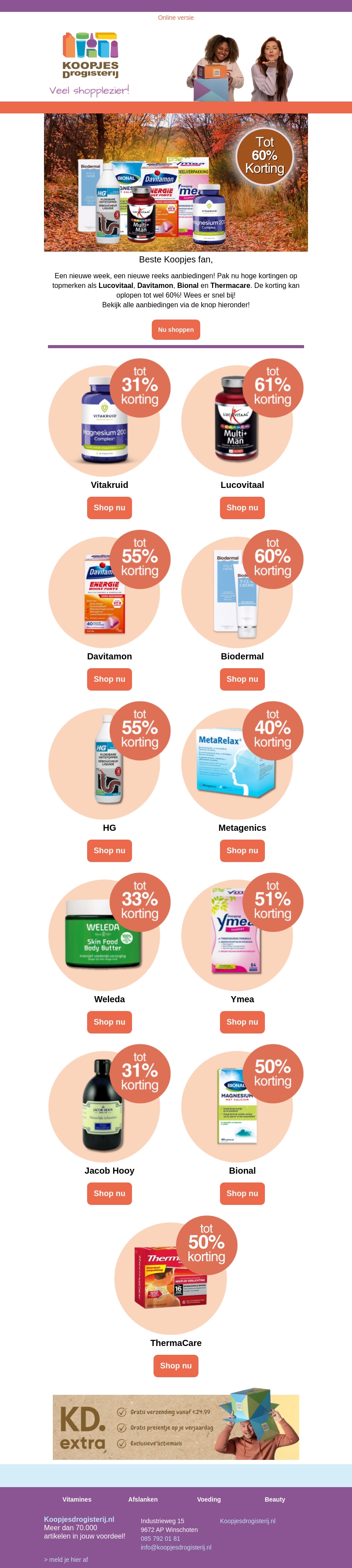 Mis deze unieke aanbiedingen niet met kortingen tot wel 60% op merken als Vitakruid, Lucovitaal, en meer. Grijp je kans met deze ongelooflijke deals en bespaar op je favoriete producten. Geniet van onze herfstpromoties en koop nu! Bezoek onze webshop voor meer geweldige aanbiedingen.