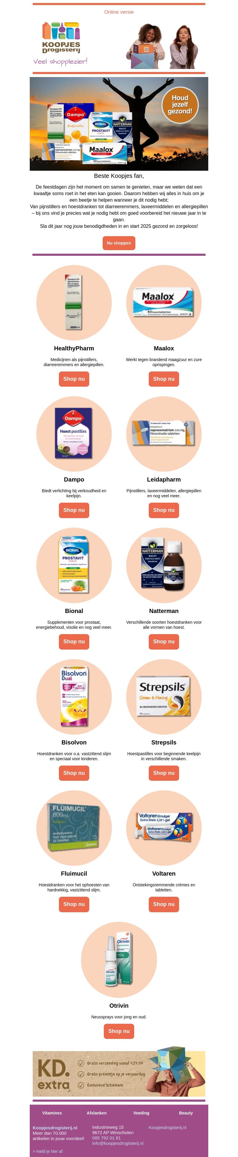 De feestdagen zijn een tijd van genieten, maar vergeet niet om goed voor jezelf te zorgen. Koopjes Drogisterij biedt een scala aan producten om gezond te blijven. Van pijnstillers tot hoestdranken, we hebben alles wat je nodig hebt. Begin het nieuwe jaar fit en voorbereid met onze hulp.