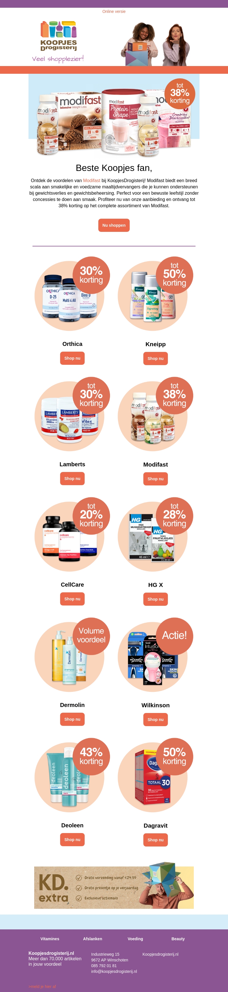 Beste Koopjes fan, ontdek de voordelen van Modifast, Orthica, HG, en Kneipp bij KoopjesDrogisterij. Geniet van kortingen tot 50% op een breed scala aan producten. Mis deze geweldige deals niet en bespaar op uw aankopen vandaag nog!