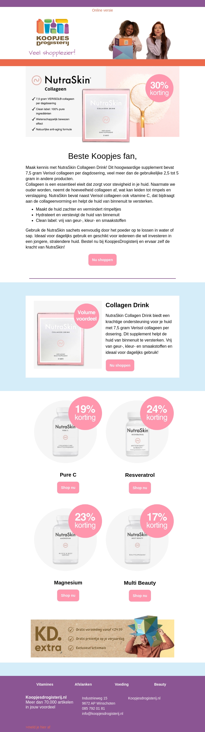 Ontdek de voordelen van NutraSkin Collageen. Dit hoogwaardige supplement bevat Verisol collageen dat helpt bij huidversteviging en anti-aging. Geniet nu van 30% korting bij KoopjesDrogisterij. Versterk je huid van binnenuit met NutraSkin.