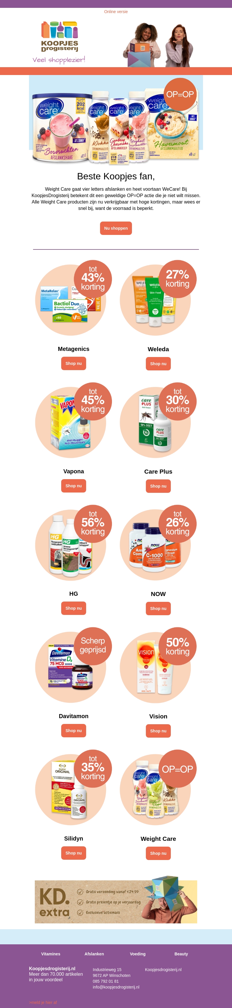 Mis de geweldige OP=OP actie bij KoopjesDrogisterij niet. Geniet van hoge kortingen op populaire merken zoals Weight Care, Metagenics, Weleda, Vapona, Care Plus, HG, NOW, Davitamon, Vision, en Silidyn. Wees er snel bij, want op is op! Bekijk nu de aanbiedingen en bespaar.