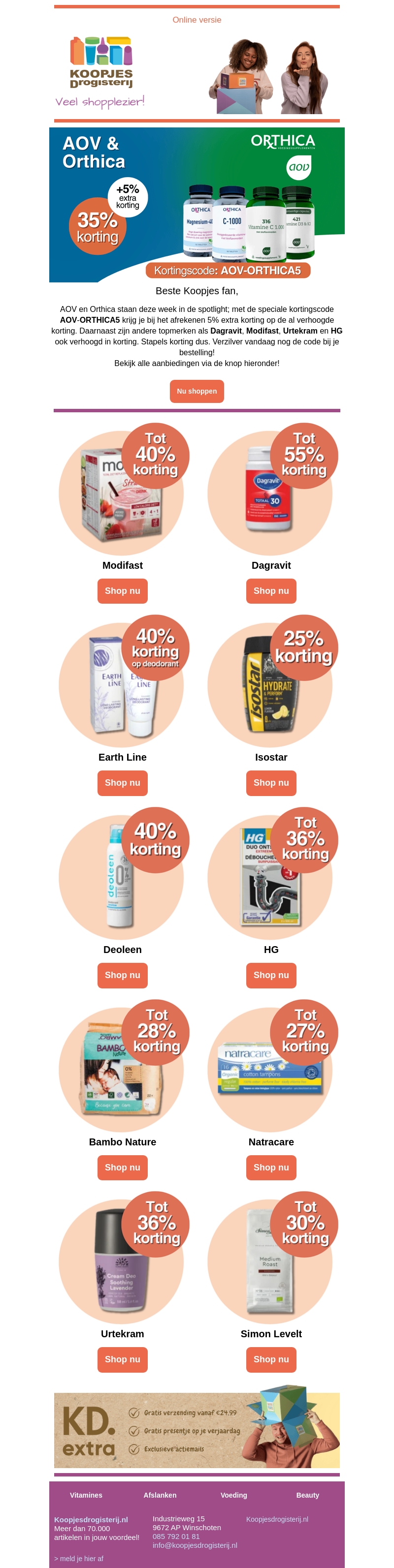 Deze week staan AOV en Orthica in de schijnwerpers bij Koopjes Drogisterij. Met de kortingscode AOV-ORTHICA5 krijg je 5% extra korting bovenop de al verlaagde prijzen. Ontdek daarnaast geweldige aanbiedingen op merken zoals Dagravit, Modifast en meer. Mis deze kans niet om te besparen op je favoriete producten! Verzeker uzelf van gezonde besparingen.