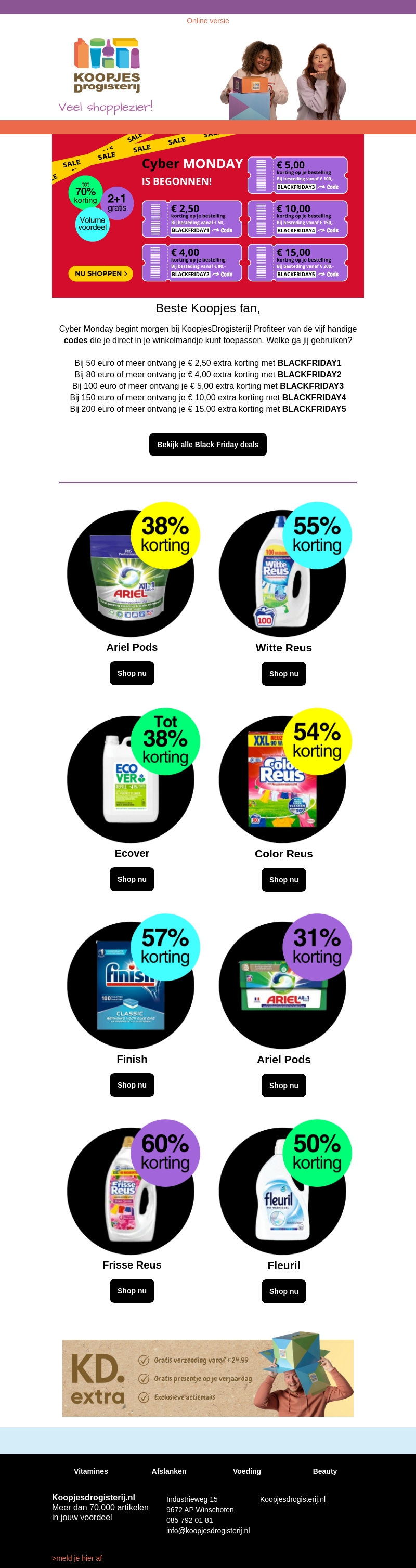 Cyber Monday is begonnen bij KoopjesDrogisterij. Ontdek exclusieve kortingen tot 70% en geniet van gratis producten. Gebruik handige kortingscodes voor extra voordeel op je bestelling. Ideaal voor wie op zoek is naar geweldige deals tijdens dit winkelhoogtepunt!