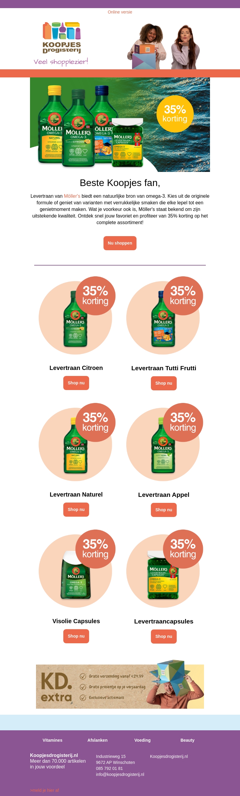 Geniet van een natuurlijke bron van Omega-3 met Möller's levertraan. Kies uit diverse smaken zoals Citroen en Tutti Frutti, of ga voor de klassieke formule. Möller's staat bekend om zijn uitstekende kwaliteit. Mis deze kans niet om 35% korting te ontvangen op het gehele assortiment. Bezoek KoopjesDrogisterij.nl voor uw voordelen.