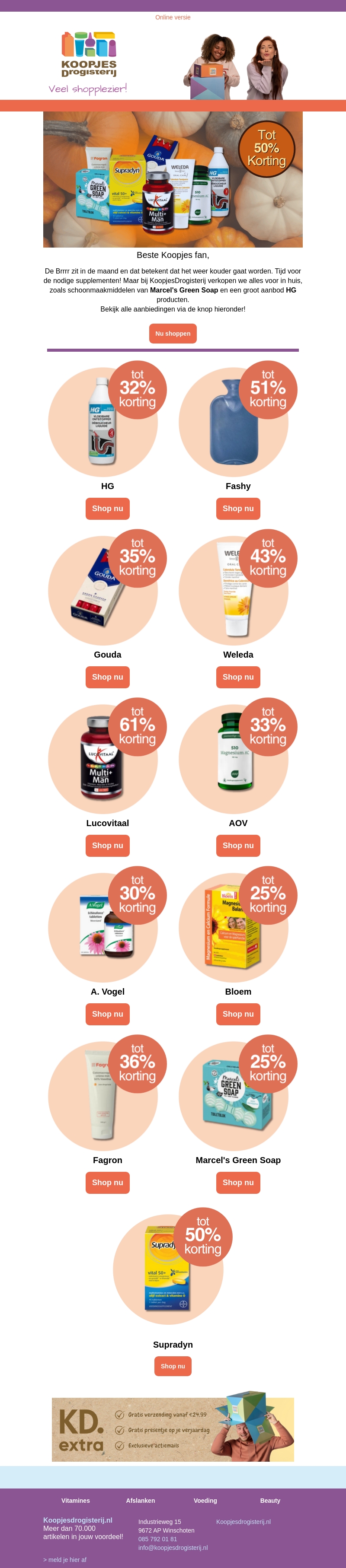 De herfst is hier en dat betekent dat het tijd is om je voorraad aan te vullen met essentiële supplementen. Bij KoopjesDrogisterij vind je kortingen tot wel 50% op merken zoals Lucovitaal, AOV, en Supradyn. Mis deze kans niet om te besparen op je favoriete producten. Of je nu op zoek bent naar vitamines, schoonmaakmiddelen of persoonlijke verzorging, er is voor elk wat wils. Bekijk alle aanbiedingen en shop nu voordelig.