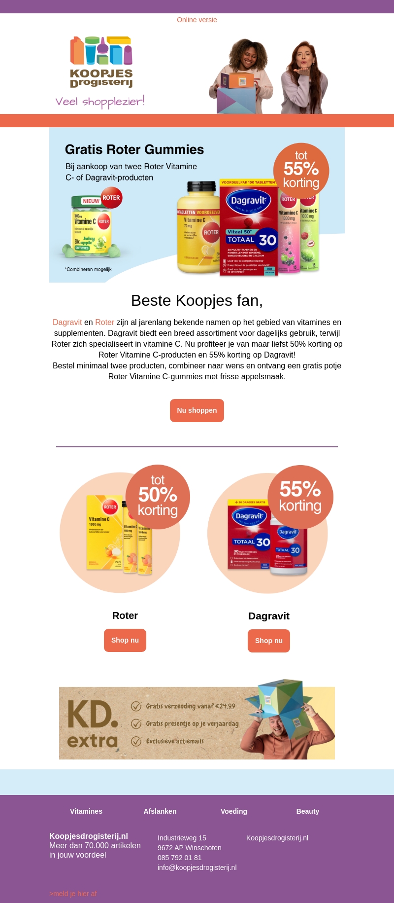 Profiteer van kortingen tot 55% op Roter Vitamine C-producten en Dagravit. Bij aankoop van minimaal twee producten, ontvang je gratis Roter Vitamine C-gummies met frisse appelsmaak. Mis deze actie niet en bespaar op je favoriete vitamines en supplementen!