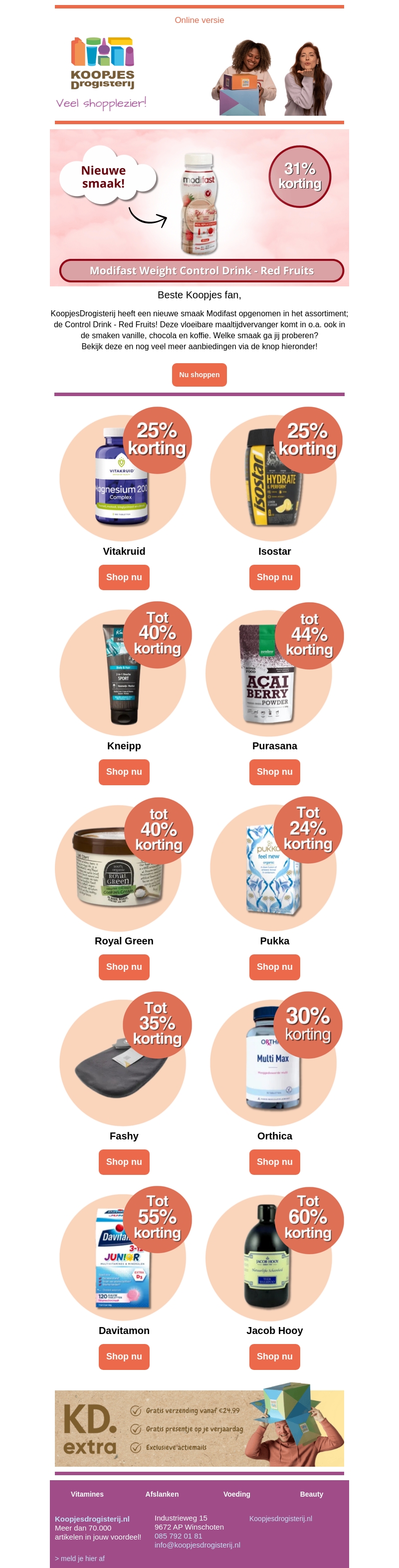 KoopjesDrogisterij introduceert de Modifast Weight Control Drink in de nieuwe smaak, Red Fruits. Deze maaltijdvervanger is perfect voor diegenen die van vanille, chocolade en koffie houden. Vergeet niet te profiteren van de 31% korting!