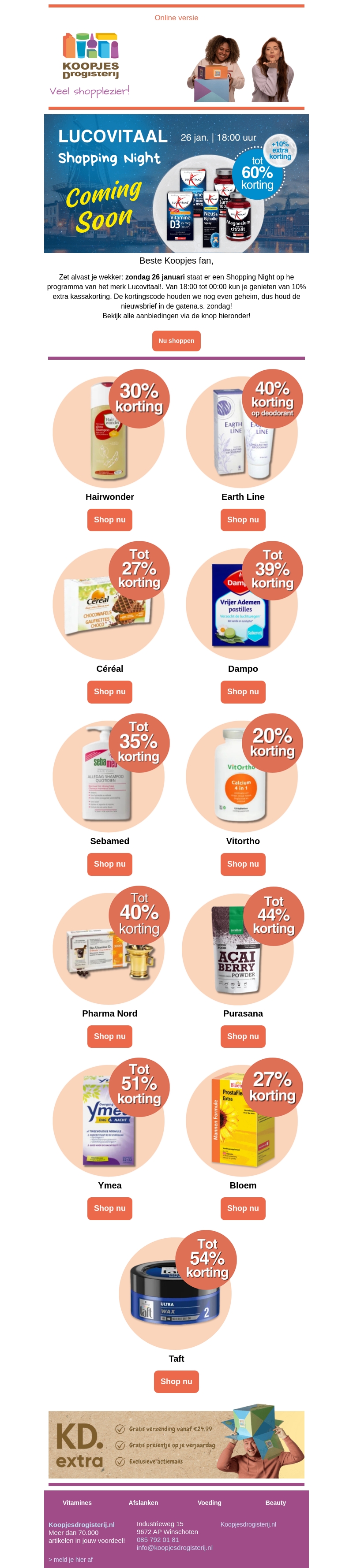Zet je wekker want op zondag 26 januari start de Lucovitaal Shopping Night. Geniet van kortingen tot wel 60% op diverse producten. Mis deze kans niet om fantastische deals te scoren op jouw favoriete merken.