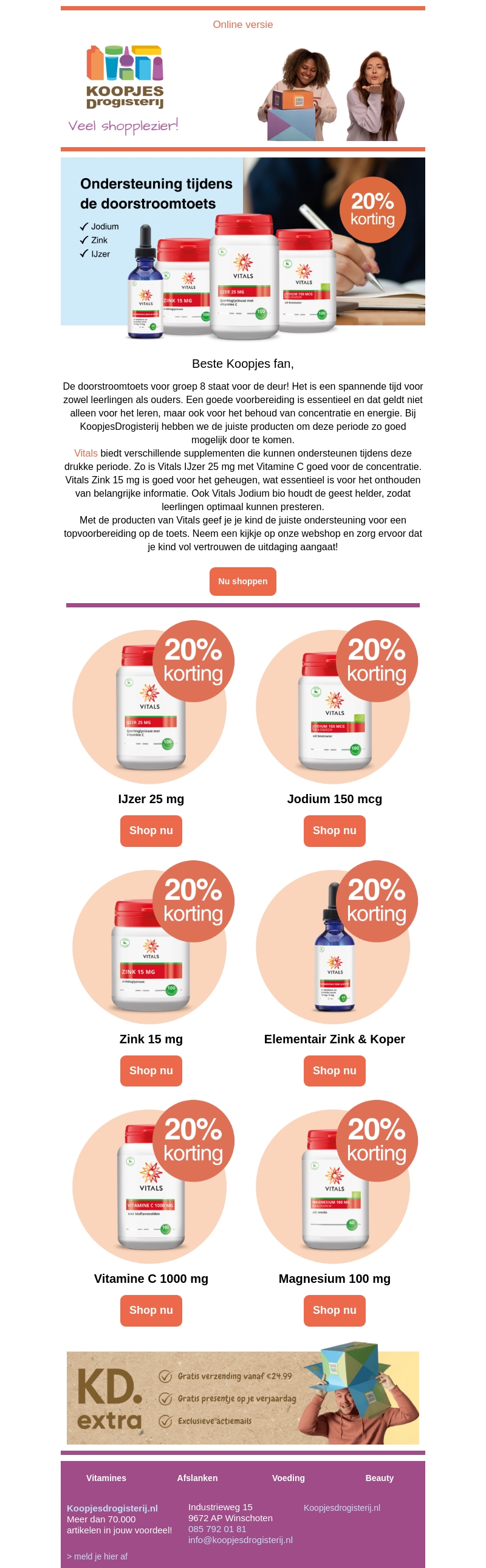 De doorstroomtoetsen komen eraan. Vitals helpt leerlingen optimaal voor te bereiden met essentiële supplementen. KoopjesDrogisterij biedt producten zoals IJzer 25 mg en Zink 15 mg aan met 20% korting. Zorg ervoor dat je niets mist en ondersteun de prestaties van je kind vandaag nog.