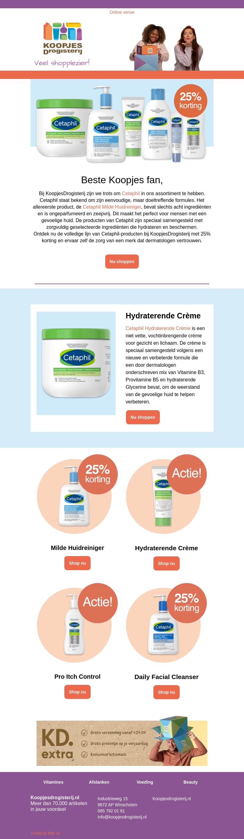 Bij KoopjesDrogisterij zijn we trots om Cetaphil in ons assortiment te hebben. Ontdek de volledige lijn van Cetaphil-producten nu met 25% korting en ervaar zelf de zorg van een merk dat dermatologen vertrouwen. Perfect voor een gevoelige huid.