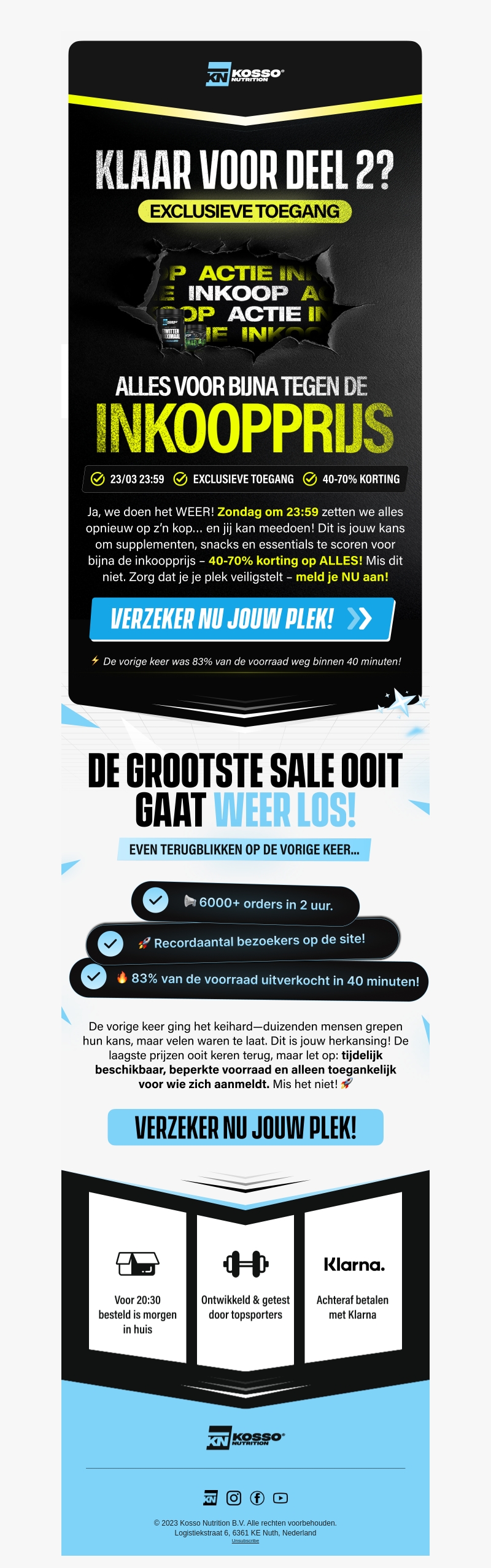 Kosso Nutrition organiseert opnieuw een enorme sale met kortingen van 40-70% op alles. Zorg dat je jouw plek reserveert voor de grootste verkoop van dit jaar en profiteer van exclusieve inkoopprijzen. De vorige keer was de voorraad binnen 40 minuten uitverkocht, dus wees er snel bij!