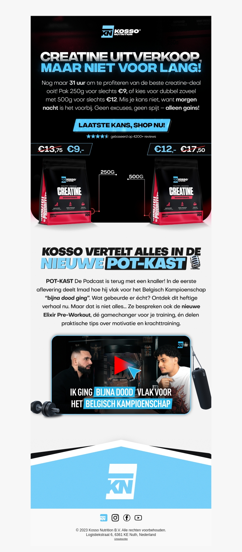 Profiteer van de laatste creatine-kortingen bij Kosso Nutrition. Ontdek 250g voor slechts โฌ9 of 500g voor โฌ12. Luister ook naar de nieuwste aflevering van de Pot-Kast, waar Imad zijn persoonlijke verhaal deelt over zijn bijna-dood ervaring. Inclusief tips voor motivatie en krachttraining.