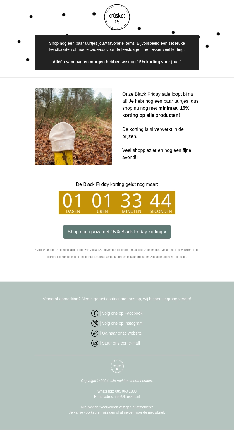 De Black Friday uitverkoop van Kruskes loopt bijna af! Haal nu nog je favoriete items binnen met minimaal 15% korting. Het aanbod geldt alleen vandaag en morgen. De korting is verwerkt in de prijzen, dus pak je kans voordat het te laat is. Veel shopplezier!