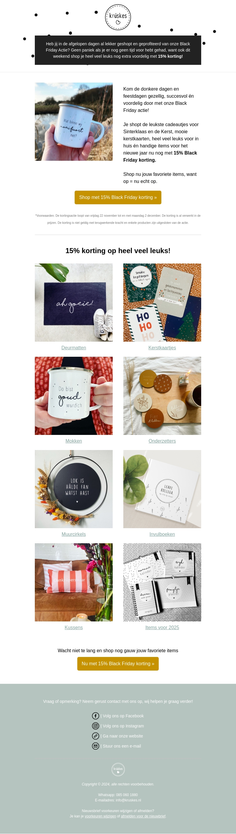 Vier de feestdagen voordelig met de Black Friday actie van Krúskes. Geniet van 15% korting op Sinterklaas- en kerstcadeaus, kerstkaarten, en handige items voor het nieuwe jaar. Mis deze kans niet om al je favoriete items nog voordeliger in huis te halen.
