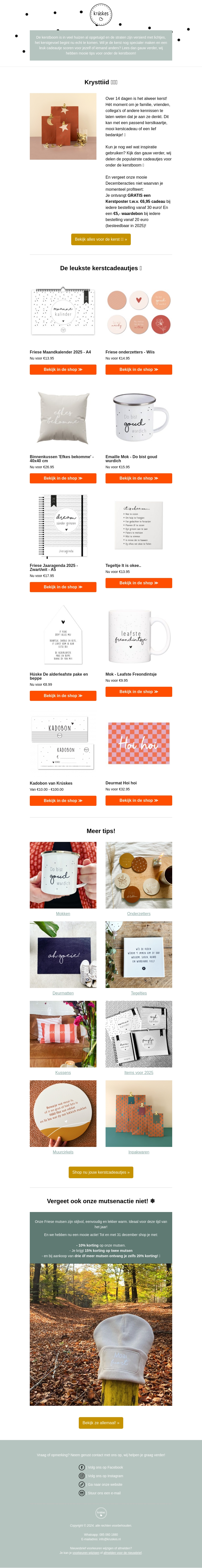 Geef dit jaar extra speciale cadeaus met onze creatieve kerstcollectie. Of je nu gaat voor een gepersonaliseerde mok, een sfeervolle kalender, of handgemaakte decoraties, ieder cadeau is ontworpen om te verrassen en te verrukken. Mis bovendien onze exclusieve mutsenactie niet om de winterstijl compleet te maken.