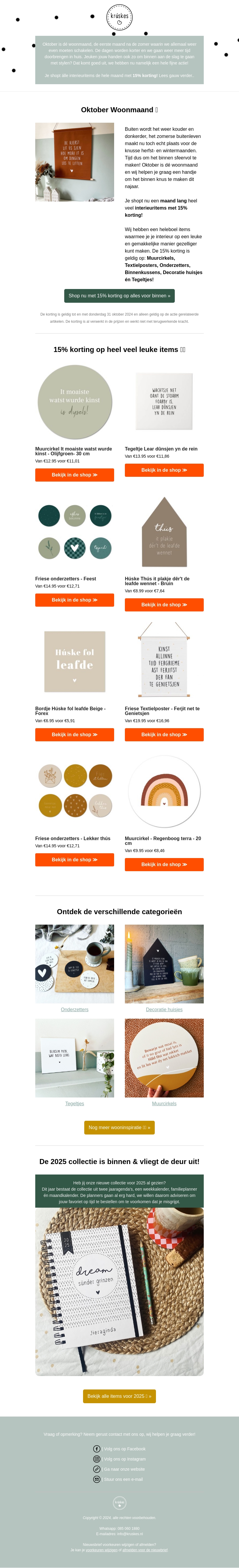 Profiteer nu van 15% korting op een selectie aan woonartikelen speciaal voor de woonmaand. Sla je slag met leuke items zoals muursticker, tekstplaatje, decoraties en meer. Bekijk snel alle aanbiedingen en verwen jezelf met nieuwe decoraties voor je huis. Mis deze kans niet en shop nu met korting!
