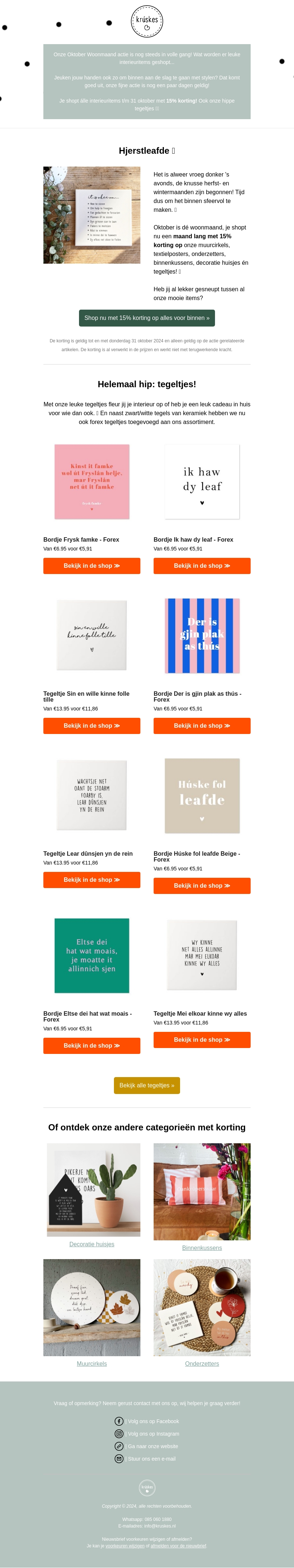 De herfst is aangebroken en Krúskes heeft een prachtige collectie om jouw huis in stijl aan te kleden. Van tegeltjes tot binnenkussens, alles met 15% korting gedurende de oktober woonmaand. Mis deze kans niet om je interieur op te frissen met unieke stukken. Bekijk ons gevarieerde aanbod en vind je nieuwe favorieten.