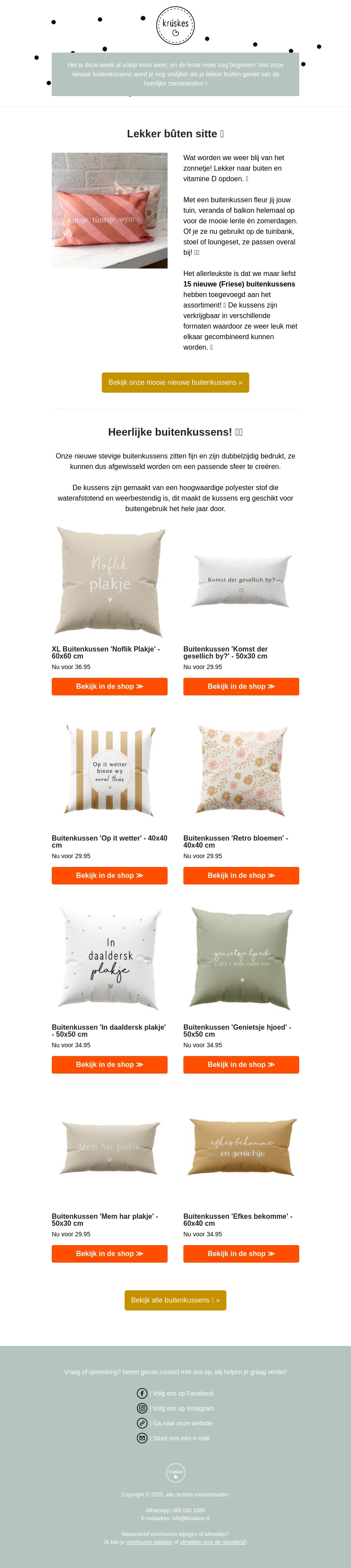 Onze nieuwe Friese buitenkussens voegen flair en comfort toe aan elke buitenruimte. Of je nu op het terras of in de tuin zit, deze kussens zijn perfect voor elke gelegenheid. Gemaakt van duurzaam polyester, ze zijn waterafstotend en weerbestendig. Bekijk onze collectie met unieke designs en kleuren die bij jouw stijl passen.