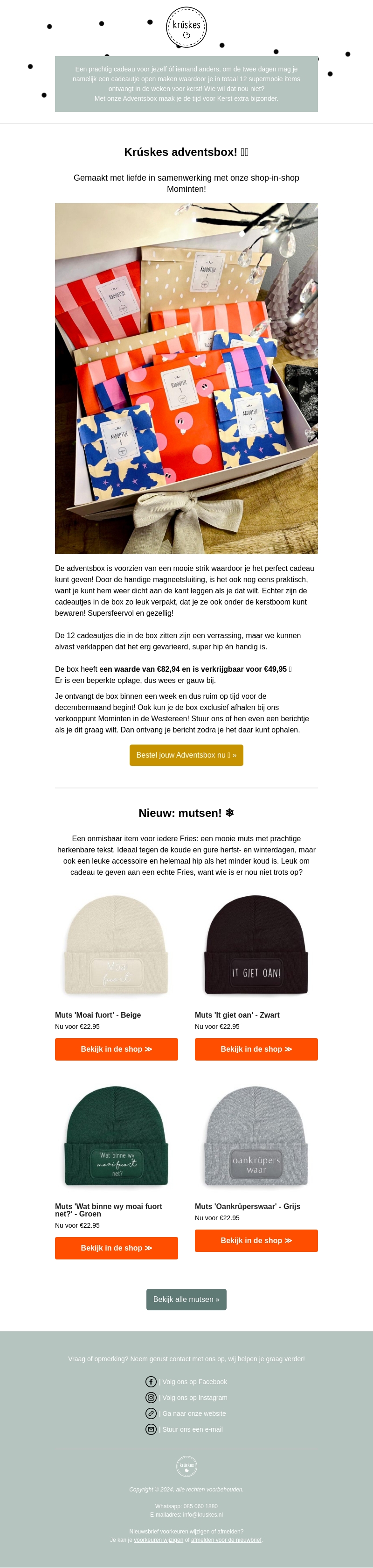 De Krúskes Adventsbox is de perfecte manier om de decembermaand extra bijzonder te maken. Met 12 verrassende cadeautjes ontvang je superleuke items voor de kerst. Daarnaast hebben we nieuwe wintermutsen beschikbaar, ideaal voor koude dagen en een perfecte accessoire. Koop nu jouw box voor een speciale prijs en ontdek ook onze nieuwe mutsen collectie.