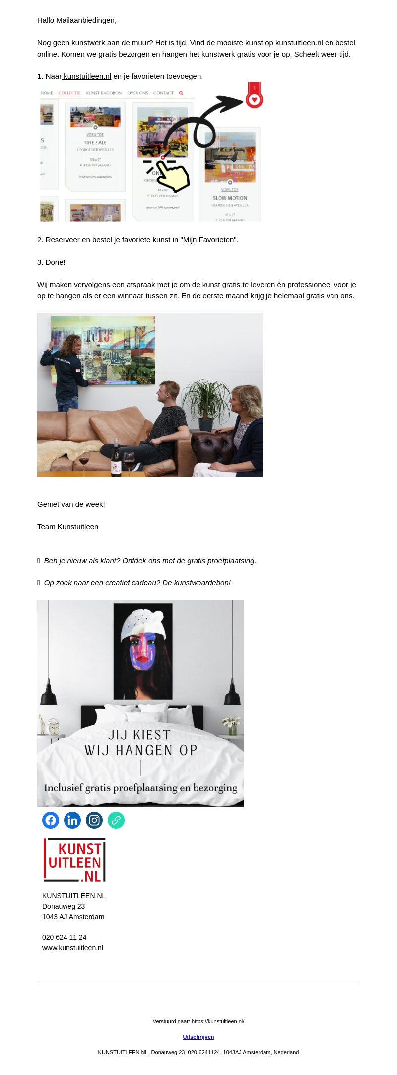 Nog geen kunstwerk aan de muur? Het is tijd. Vind de mooiste kunst op kunstuitleen.nl en bestel online. Wij bezorgen en hangen het kunstwerk gratis voor je op. Ontdek onze gratis proefplaatsing en de kunstwaardebon.