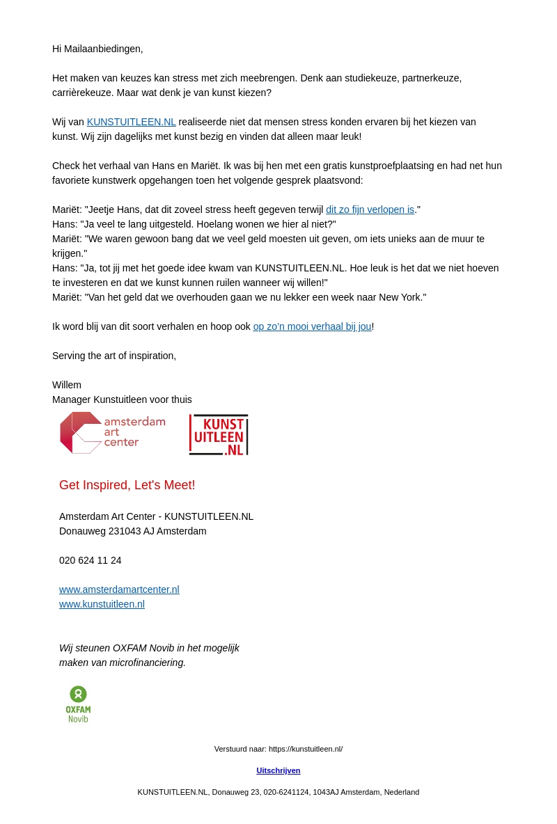 Het maken van keuzes kan stressvol zijn. Kunstuitleen.nl biedt een unieke oplossing voor kunstliefhebbers door kunst te lenen en te ruilen wanneer je wilt. Lees het inspirerende verhaal van Hans en Mariët die stressvrij kunst kiezen. Ook jij kunt je eigen kunstverhaal beleven!