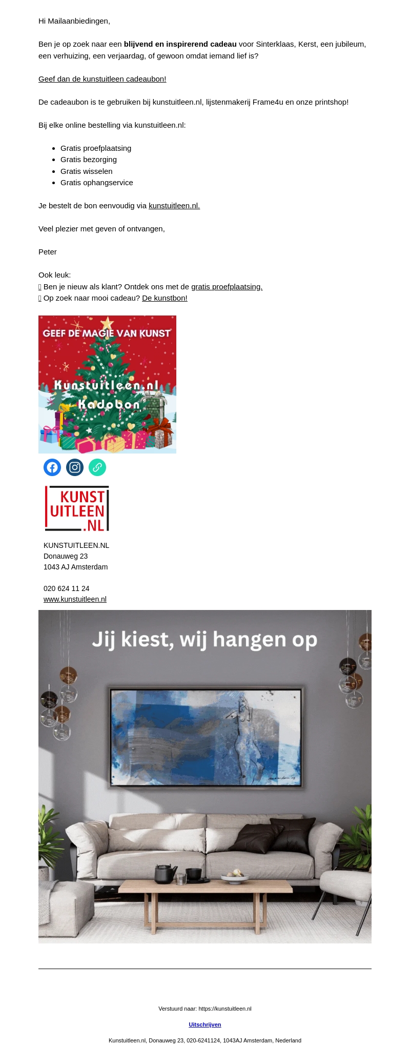 Op zoek naar een uniek cadeau voor Sinterklaas, Kerst of een verjaardag? Geef een kunstuitleen cadeaubon! Geniet van gratis proefplaatsing, bezorging, wisselen en ophangservice. Bestel eenvoudig via kunstuitleen.nl en verras jezelf of een ander met inspirerende kunst.