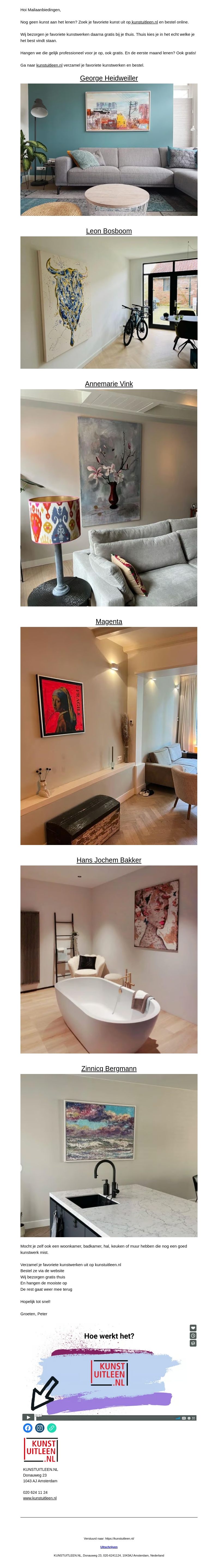 Nog geen kunst aan de muur? Bezoek onze website en ontdek de volledige kunstuitleen collectie online. Wij bezorgen jouw favoriete kunstwerken gratis bij je thuis. Hang een professioneel werk op zonder zorgen. Bekijk de galerij en bestel direct!