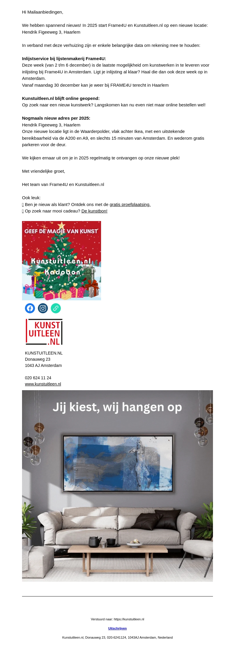 Frame4U en Kunstuitleen.nl verhuizen in 2025 naar Hendrik Figeeweg 3, Haarlem. Laatste mogelijkheid voor inlijsten in Amsterdam is van 2 t/m 6 december. Kunstuitleen.nl blijft ook online beschikbaar. Nieuwe locatie biedt uitstekende bereikbaarheid en gratis parkeren.