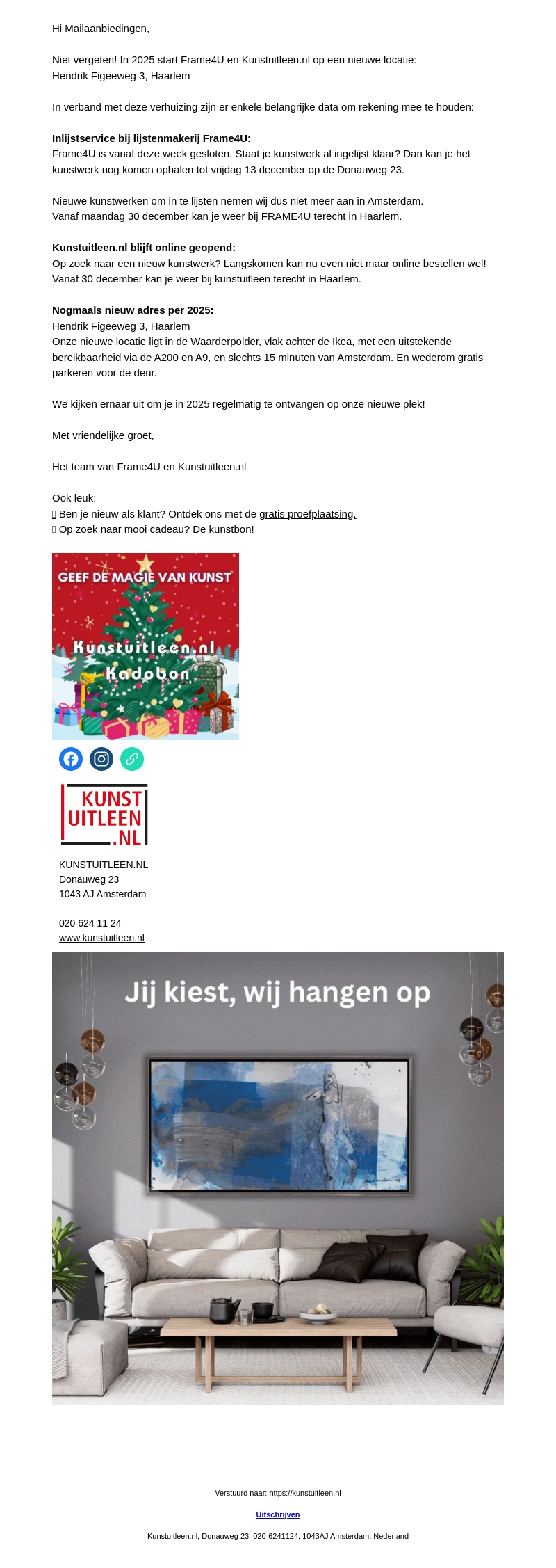 Frame4U en Kunstuitleen.nl verhuizen in 2025 naar een nieuwe locatie in Haarlem. Specifieke data zijn belangrijk voor het ophalen van kunstwerken en het opnieuw starten van de inlijst- en uitleenservice. Bezoekers kunnen vanaf 30 december weer terecht. Ontdek ook onze proefplaatsing en kunstbon.