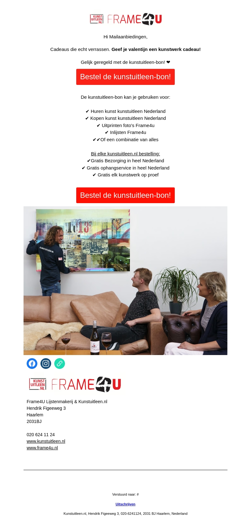 Geef dit Valentijnsdag een uniek kunstcadeau met de kunstuitleen-bon. Kies uit huren, kopen, printen of inlijsten van kunstwerken bij Frame4U en Kunstuitleen.nl. Profiteer van gratis bezorging en ophangservice in heel Nederland, plus een gratis proefkunstwerk.