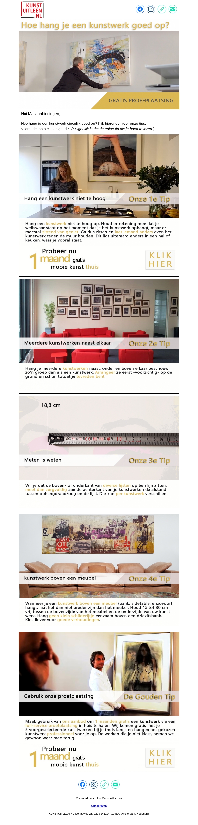 Leer hoe je kunstwerken op de juiste manier ophangt met onze handige tips. Van het niet te hoog hangen van kunstwerken tot het groeperen van meerdere kunstwerken, wij hebben de beste adviezen voor jou. Vooral de laatste tip is goud waard! Probeer onze gratis proefplaatsing en geniet van mooie kunst thuis.