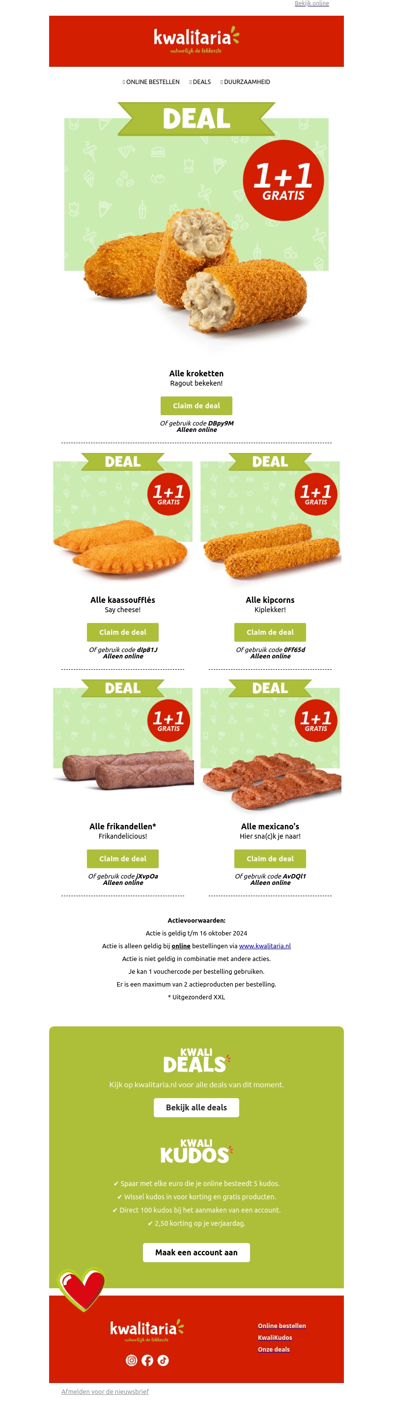 Verwen jezelf met de smakelijke 1+1 gratis actie op kroketten, kaassoufflés, kipcorns, frikandellen en mexicano's bij Kwalitaria. Deze geweldige aanbieding is alleen online geldig tot 16 oktober 2024. Claim je deal eenvoudig met de aangeboden kortingscodes. Wacht niet langer, geniet van de beste snacks voor de beste prijs!