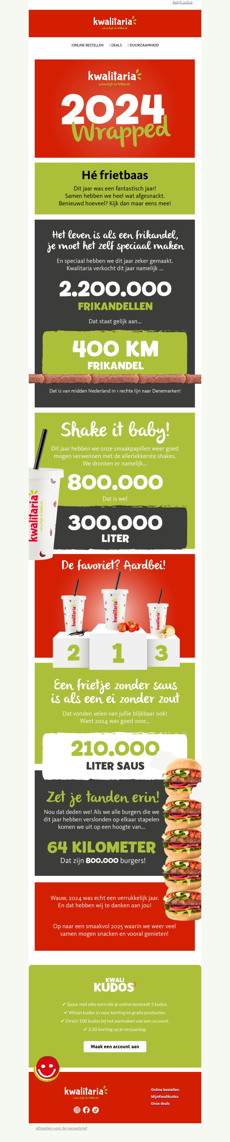 Kwalitaria blikt terug op een heerlijk jaar vol met lekkere frikandellen, sappige burgers en verfrissende shakes. Met tonnen aan saus en smakelijke stats vieren we samen dit succes. Kijk uit naar nog meer smaakvolle momenten in het komende jaar!