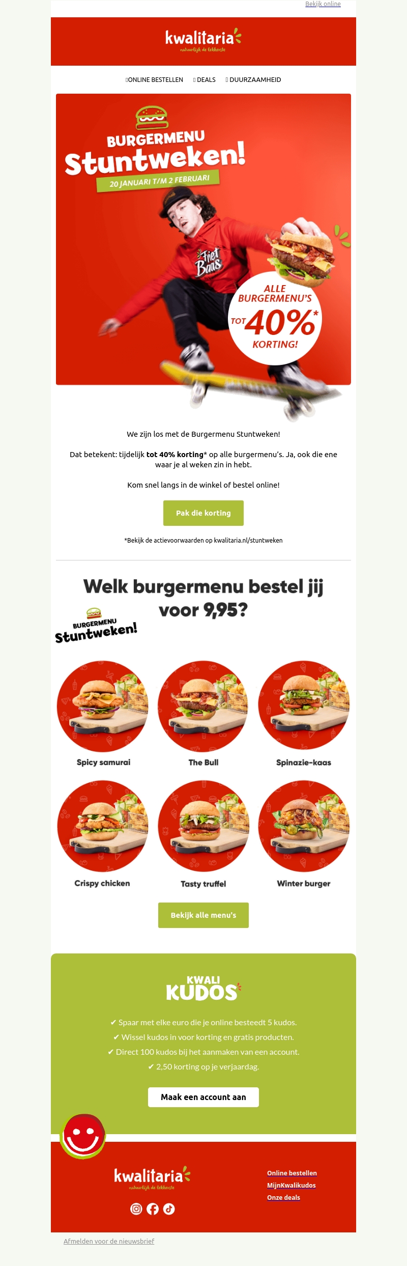 De Burger Stuntweken zijn begonnen bij Kwalitaria! Geniet van tot wel 40% korting op alle burgermenu's, waaronder de Spicy Samurai en Winter Burger. Kom langs of bestel online en ontdek jouw nieuwe favoriet. Bespaar extra met Kwali Kudos. Bekijk de voorwaarden online.