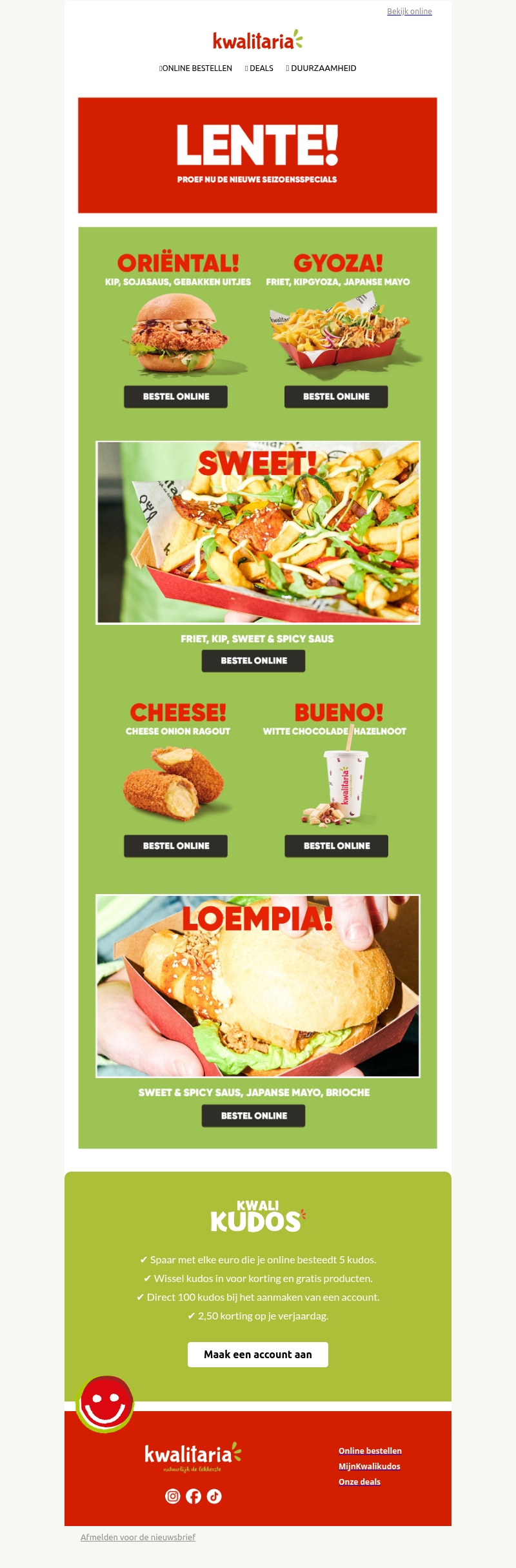 Lente is in volle bloei bij Kwalitaria met hun nieuwe seizoensspecials. Geniet van heerlijke gerechten zoals de Oriëntaalse kipburger, knapperige gyoza friet en zoete snacks. Mis de unieke combinaties van smaken niet, speciaal samengesteld voor dit seizoen. Spaar voor kortingen met Kwali Kudos. Bekijk en bestel nu online voor een waanzinnig lenteavontuur.