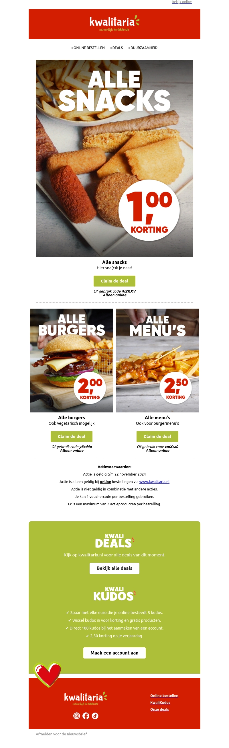 Ontdek heerlijke kortingen bij Kwalitaria op snacks, burgers en menu's. Geniet van €1 korting op alle snacks, €2 korting op burgers inclusief vegetarische opties, en €2,50 korting op menu's. Gebruik unieke couponcodes bij online bestellingen. Mis deze smaakvolle deals niet en bezoek onze website!