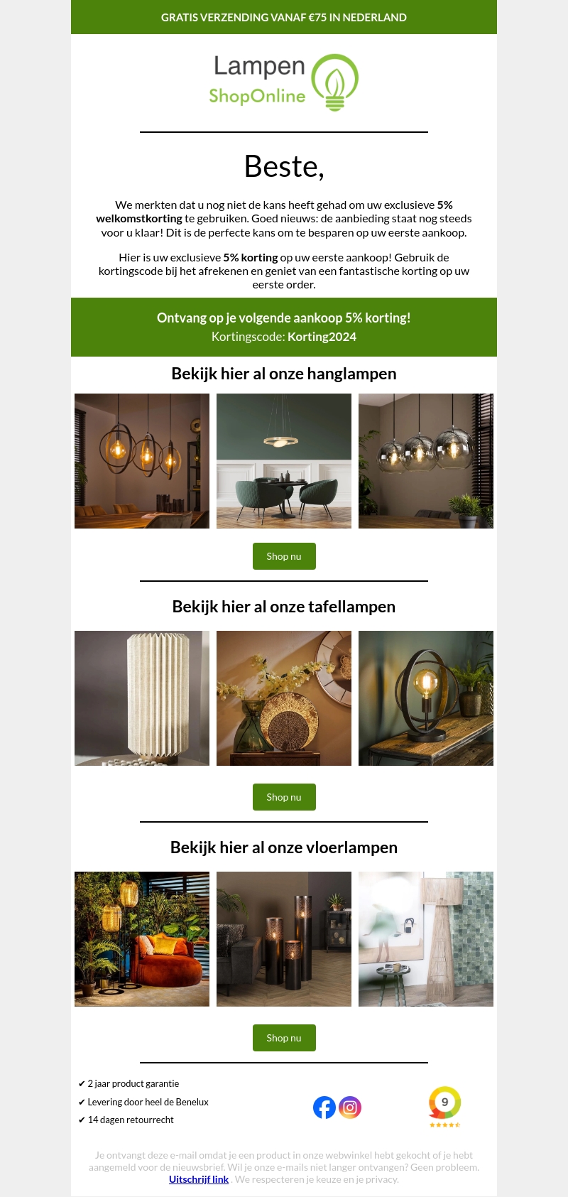 Wees er snel bij en profiteer nu van een exclusieve korting van 5% op je eerste aankoop bij Lampen ShopOnline. Gebruik de kortingscode Korting2024 tijdens het afrekenen. Ontdek ons assortiment hanglampen, tafellampen en vloerlampen in diverse stijlen en designs.