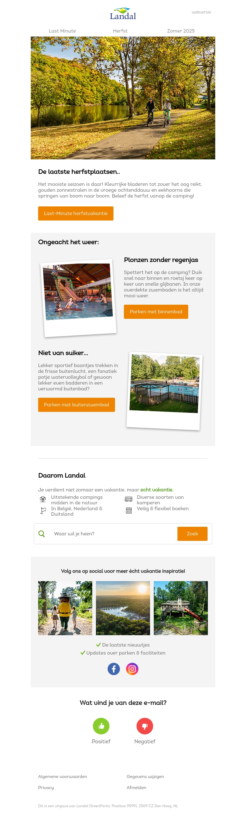 Beleef de herfst in al zijn kleuren bij Landal campings. Geniet van de vroege ochtenden, kleurrijke bladeren en ga op avontuur, wat het weer ook doet. Ontdek binnen- en buitenuitjes voor elk seizoen zonder zorgen over regen. Onze campings bieden een perfecte mix van ontspanning en avontuur voor het hele gezin.