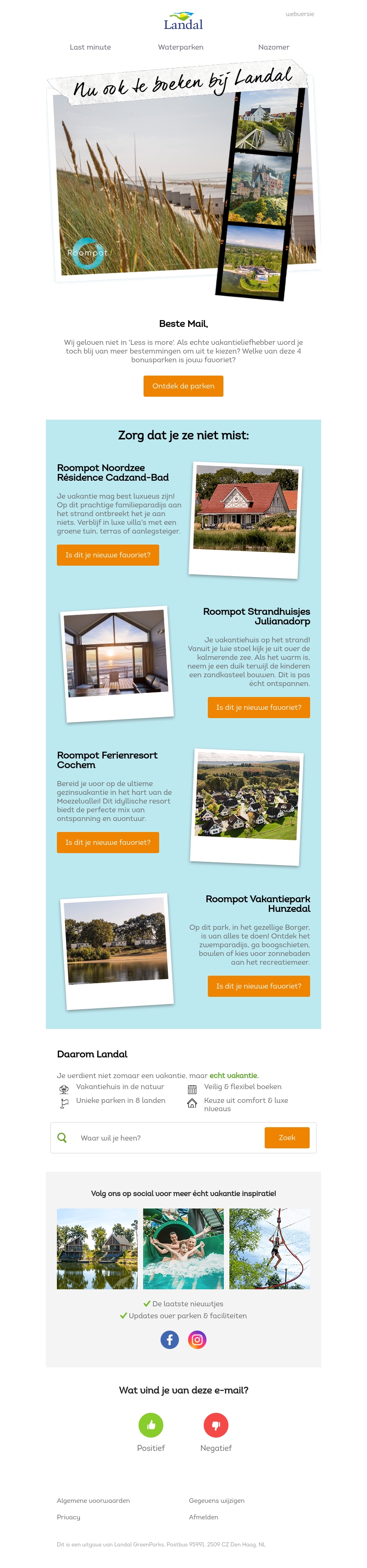 Beste Mail, ontdek nu de prachtige vakantieparken van Landal. Of je nu houdt van de kust, het bos of een heuvelachtig landschap, Landal biedt diverse locaties voor een perfecte vakantie. Profiteer van luxe voorzieningen en unieke parken in heel Nederland. Mis deze kans niet om te ontspannen en te genieten van de natuur!