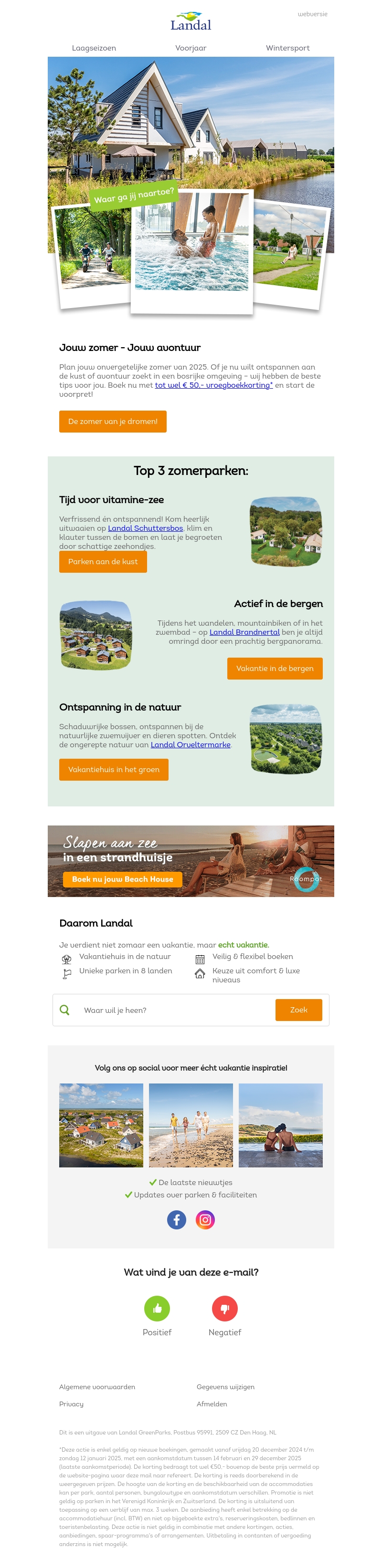 Beleef een onvergetelijke zomer met onze top 3 parken. Geniet van de kust, de bergen of de natuur en maak gebruik van aantrekkelijke kortingen. Boek nu jouw droomvakantie bij Landal en ervaar een heerlijke ontsnapping in de mooiste regio's van Nederland.