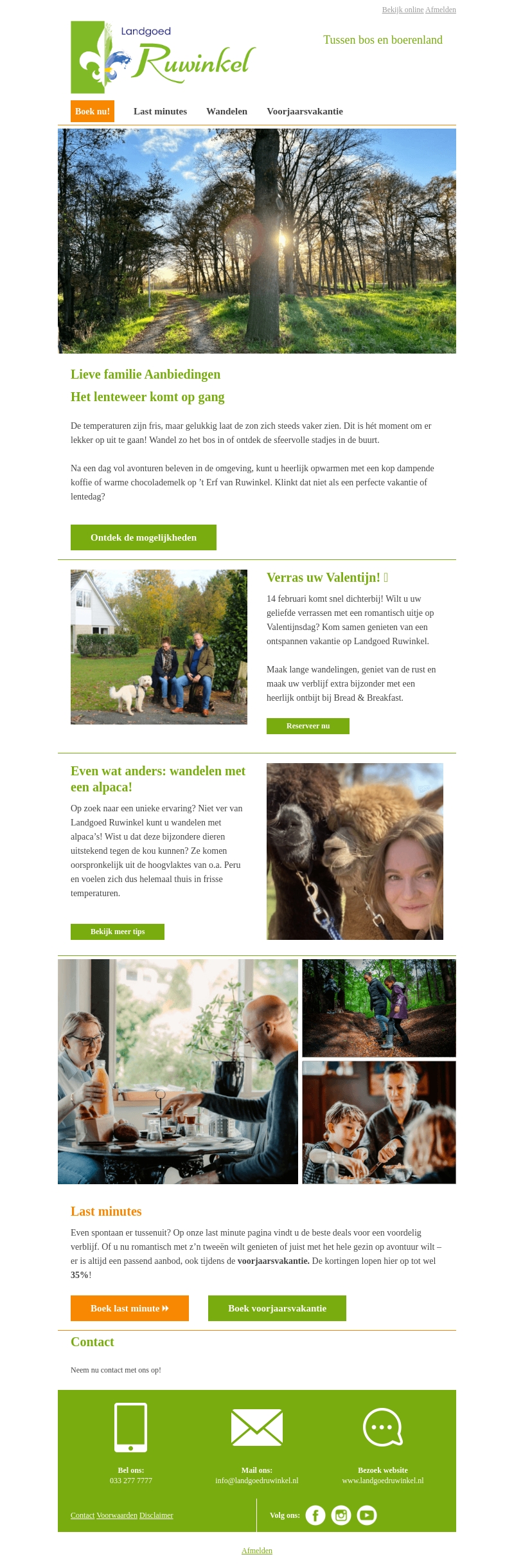 Met de lente in aantocht nodigt Landgoed Ruwinkel u uit om te genieten van de opkomende zon en de frisse buitenlucht. Verken wandelroutes, beleef avonturen met alpaca's, en ontdek aantrekkelijke last minute aanbiedingen. Geniet van een ontspannen vakantie midden in de natuur. Mis de kans niet op kortingen tot 35%! Reserveer snel uw verblijf.