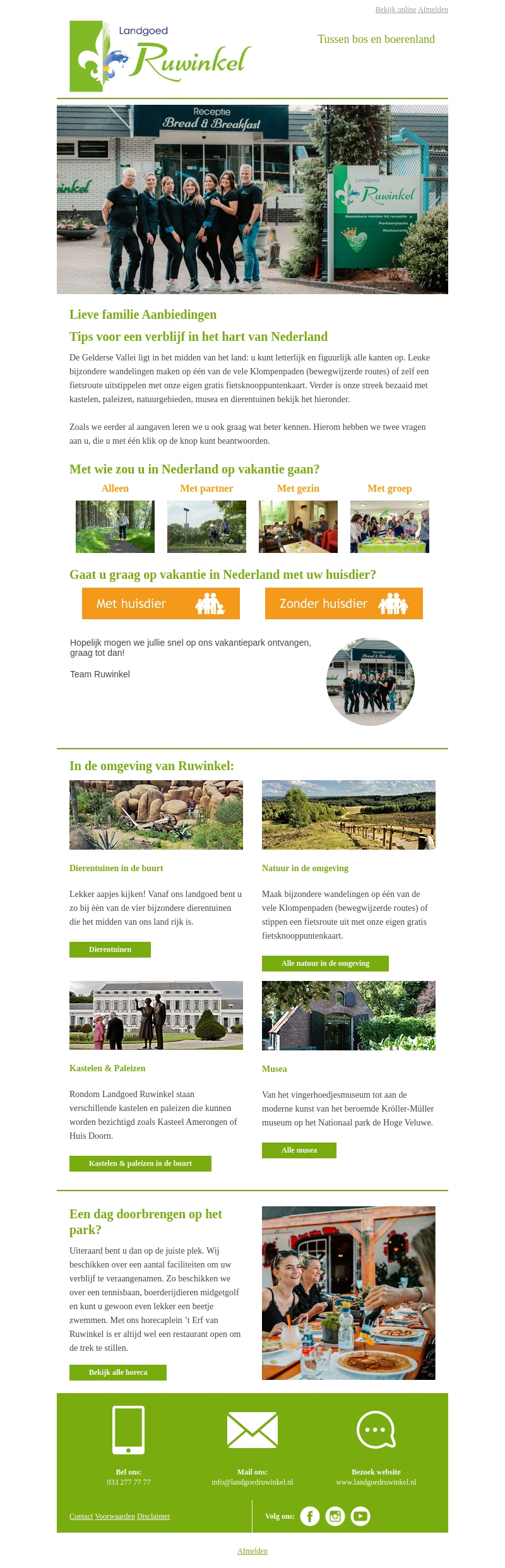 Beleef een onvergetelijke vakantie in het hart van Nederland bij Landgoed Ruwinkel. Maak bijzondere wandelingen, bezoek kastelen, musea, en geniet van de natuur. Met wie gaat u het liefst op vakantie? Met of zonder huisdier, er is voor ieder wat wils!