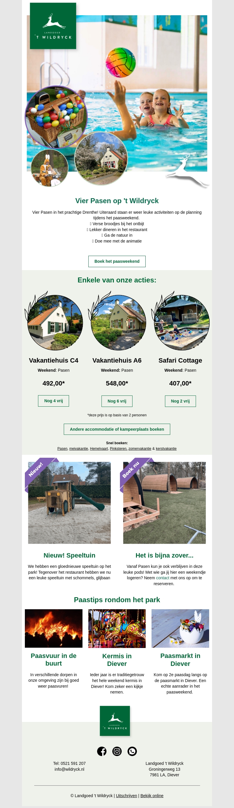 Beleef een onvergetelijk paasweekend op Landgoed 't Wildryck. Geniet van diverse activiteiten zoals vers brood bij het ontbijt, dineren in het restaurant en animatie. Boek nu een verblijf in een van onze vakantiehuizen tegen speciale tarieven. Mis het paasvuur, de kermis en de paasmarkt in de buurt niet!