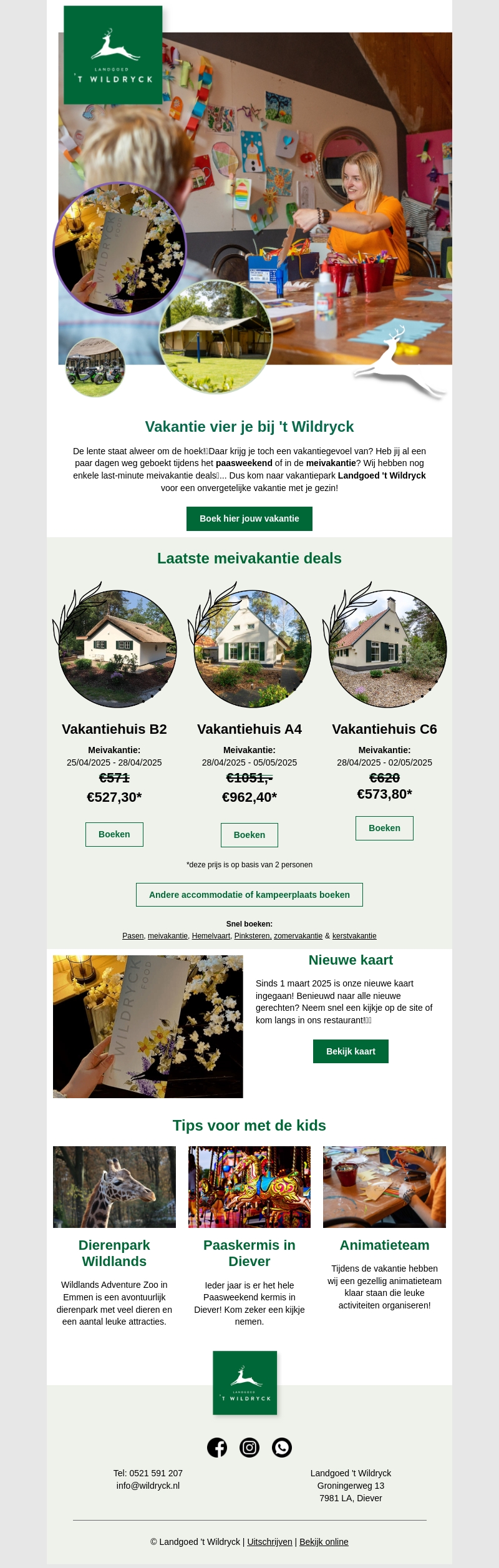 Vier de meivakantie met geweldige last-minute deals bij Landgoed 't Wildryck. Geniet van aantrekkelijke prijzen op accommodaties in de prachtige natuur. Ontdek de nieuwe menukaart in ons restaurant en beleef plezier met het animatieteam voor kinderen. Mis de Paaskermis in Diever niet!