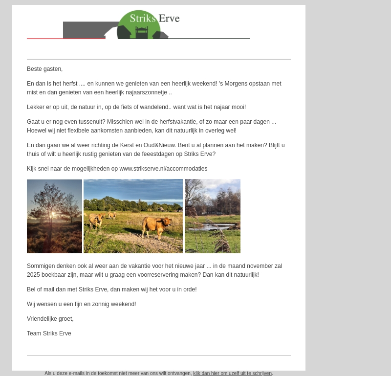 Het is herfst bij Striks Erve en tijd om te genieten van de natuur en wandelroutes. Denk aan uw herfstvakantie of de komende feestdagen, inclusief Kerst en Oud & Nieuw. Ontdek de mogelijkheden en boek voor een ontspannen verblijf bij Striks Erve.