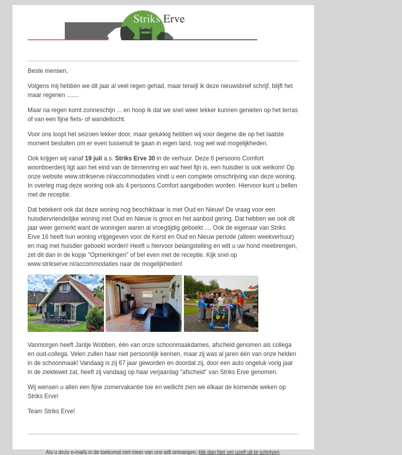 Beste mensen, Striks Erve biedt vanaf 19 juli een 6-persoons Comfort woning aan voor verhuur. Honden toegestaan. Wees er snel bij, vooral voor de feestdagen en weekenden. Daarnaast nemen we afscheid van onze collega Jantje Wobben. Fijne zomervakantie!